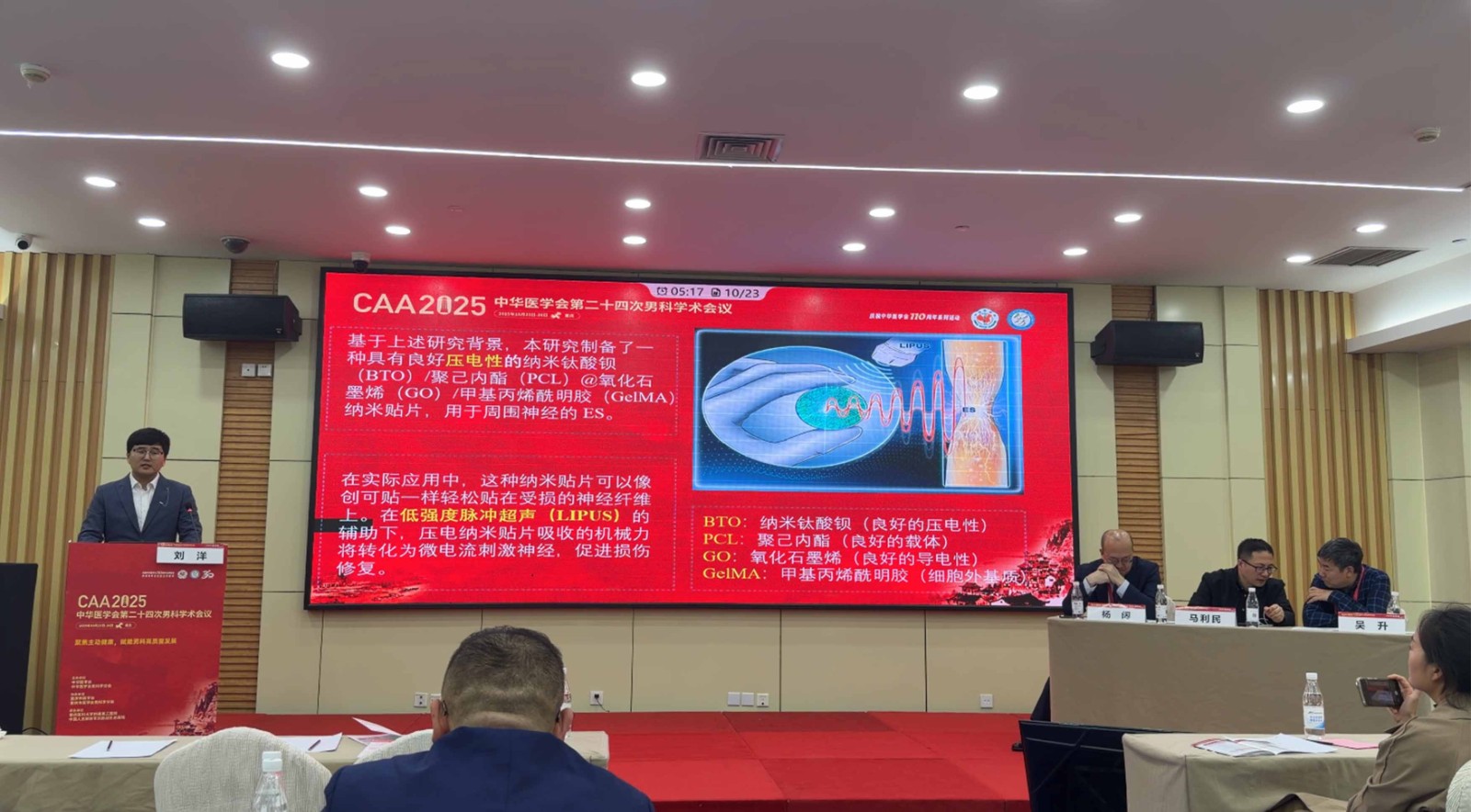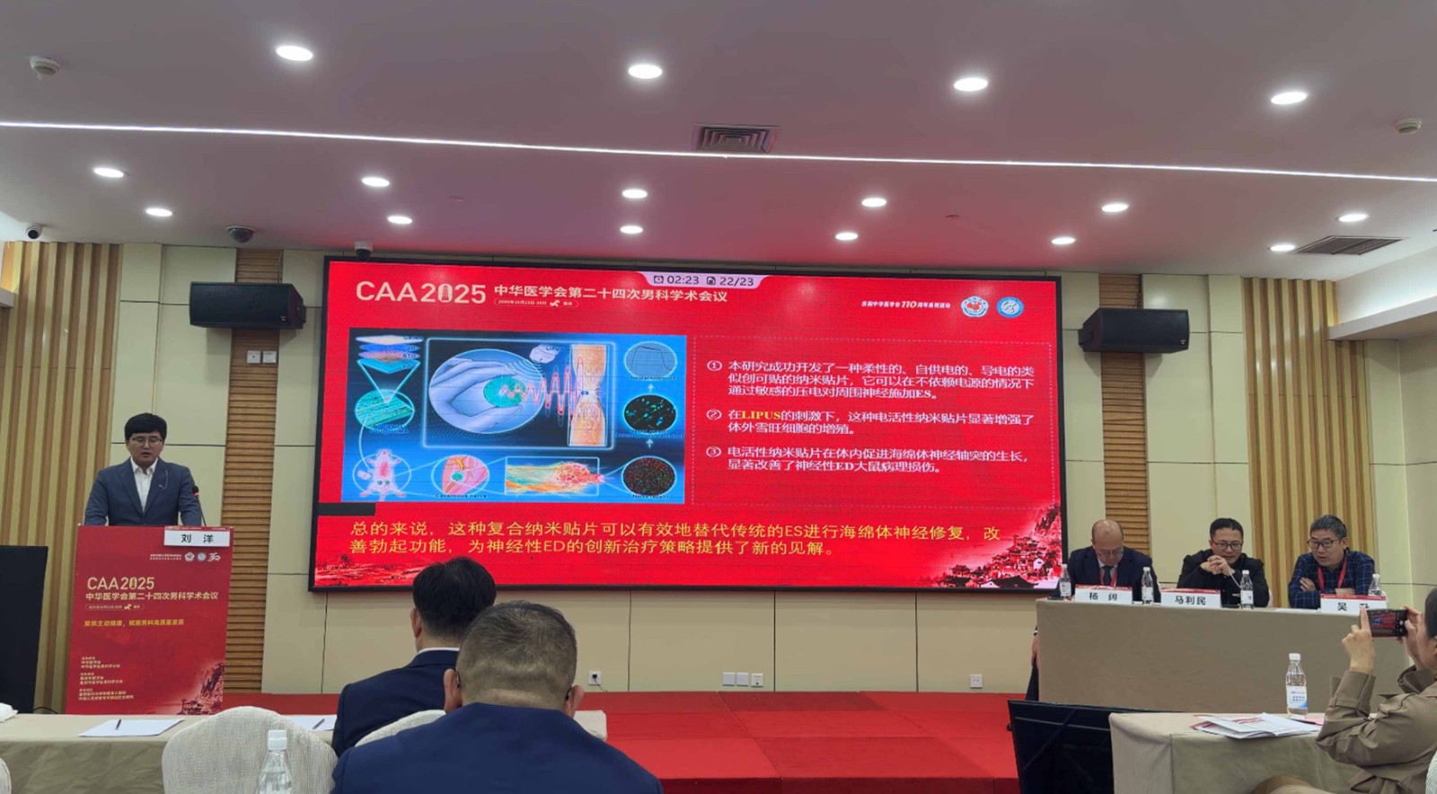 长春中医药大学附属医院 刘洋在论文发言中提出《无线控制的超声—电刺激纳米贴片用于修复阴茎神经损伤:一种跨界治疗新范式》,探索了LIPUS超声技术与电刺激的协同创新,为神经损伤修复开辟了新路径。